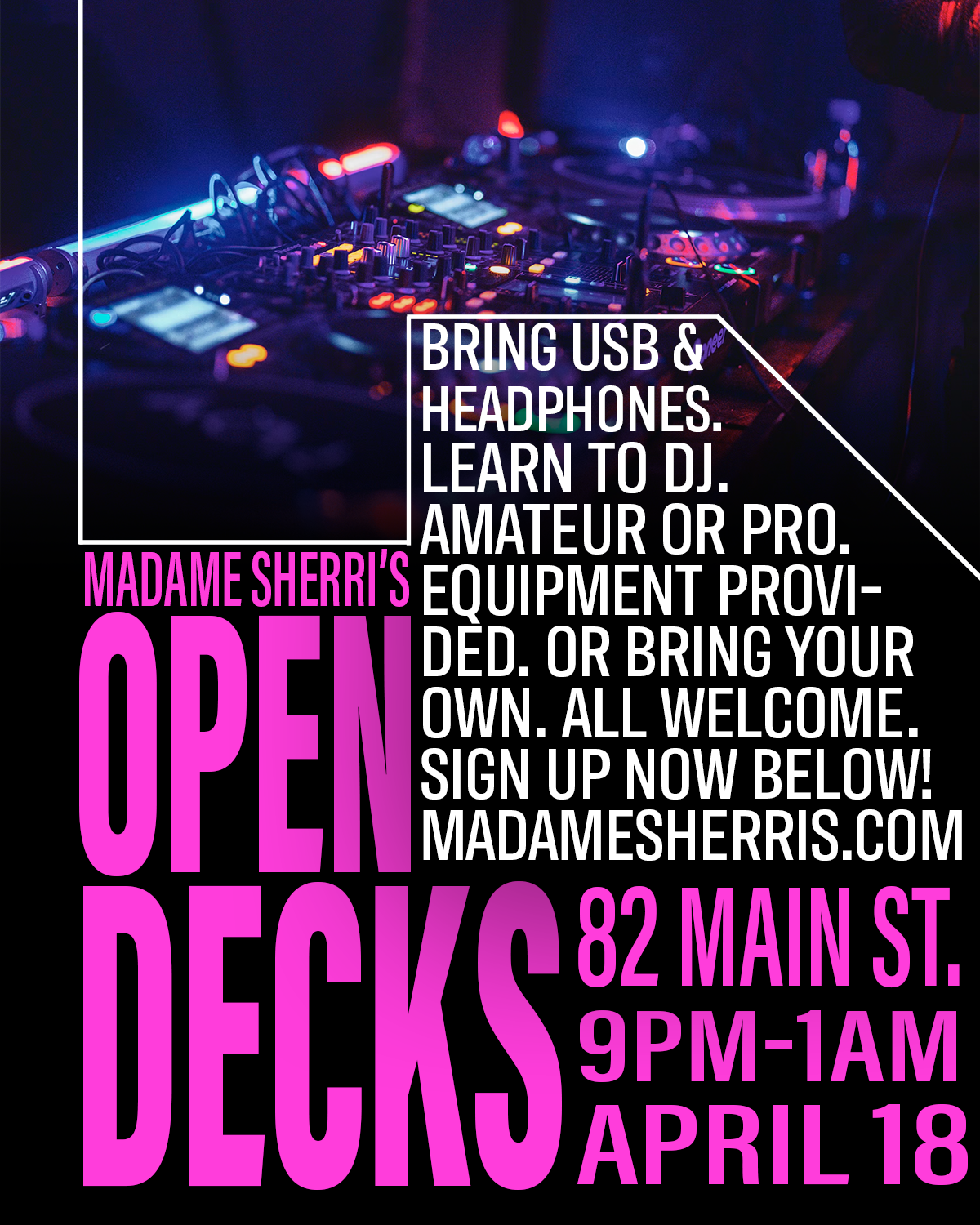 Beginner, amateur and pro DJs and VJs welcome.